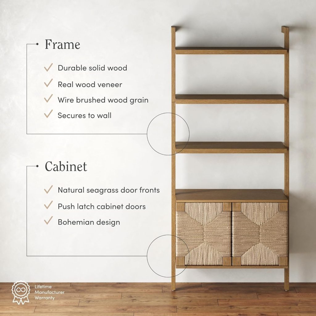 - Ample Storage Space: With three open shelves and a storage cabinet featuring seagrass door fronts, this bookshelf provides plenty of space to display and organize books, decorative items, and personal belongings.