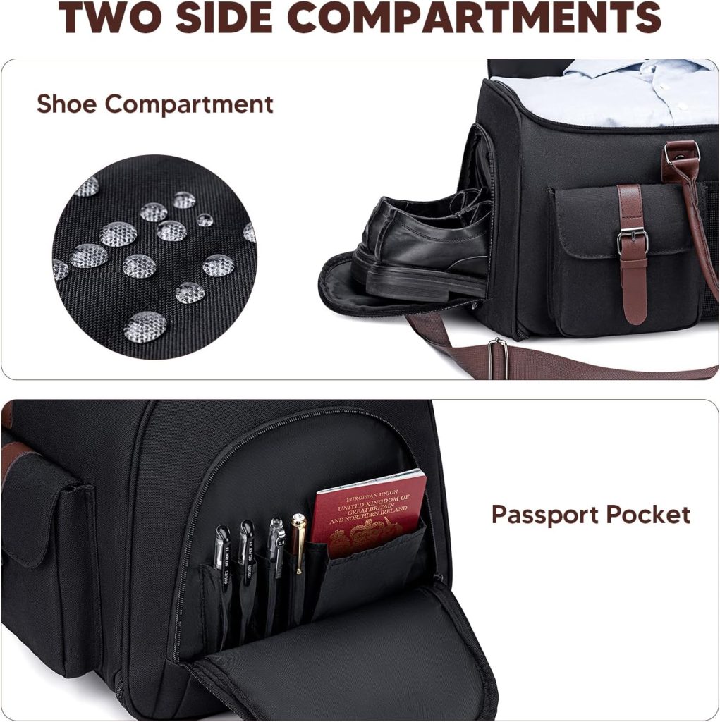 - Shoe Compartment: Featuring a dedicated shoe compartment, this bag keeps footwear separate from clothing, preventing dirt and odors from affecting your garments. It adds an extra layer of organization and convenience to your travels.